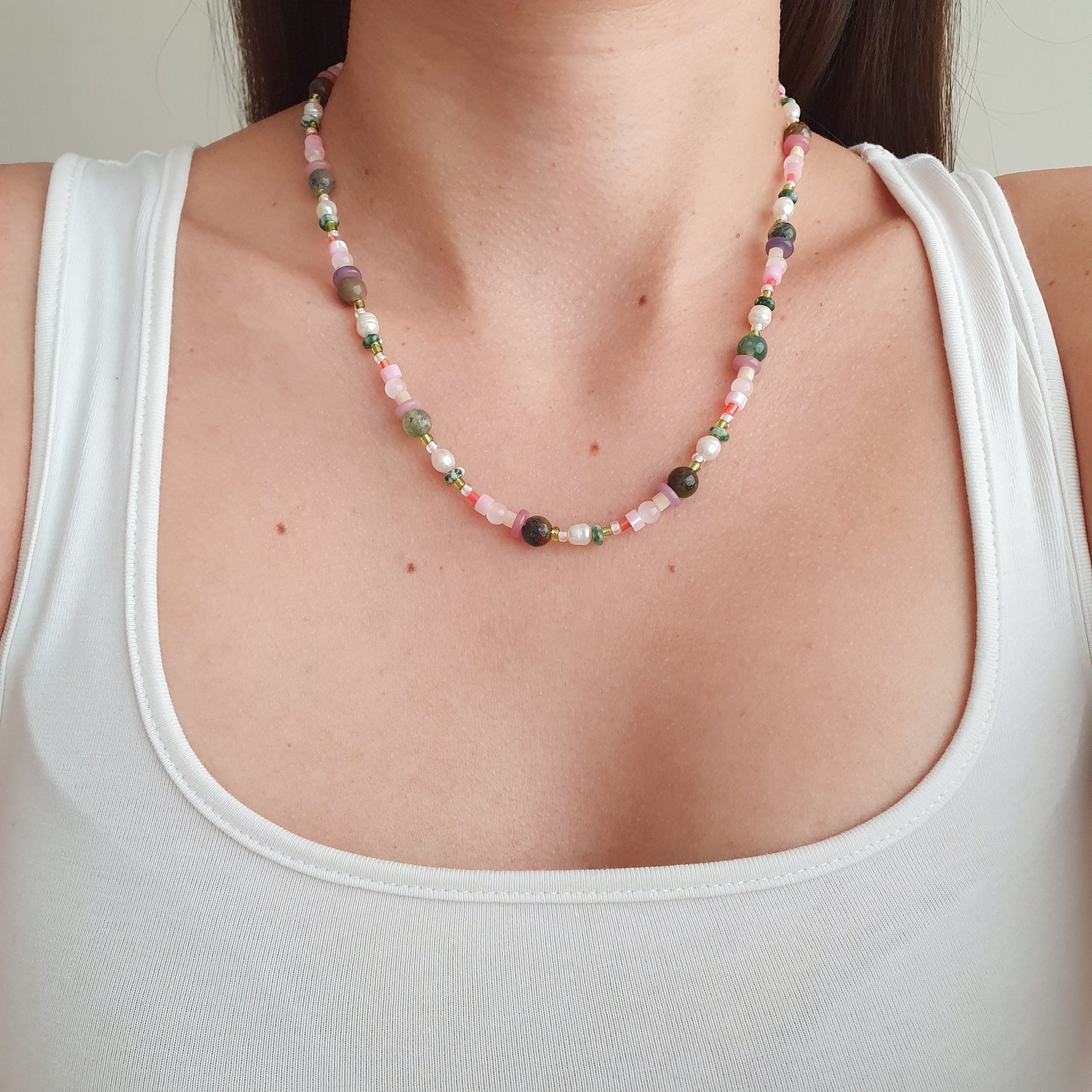 Material: Acero inoxidable, chaquira, piedras naturales y perla de río